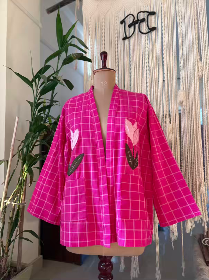 Bold, joyful, and unapologetically vibrant — the Tulip Grid Kimono Jacket is designed to make a statement. Crafted from lightweight breathable handwoven fabric, this piece features a striking hot pink base accented with a subtle white windowpane check pattern for a modern yet playful appeal.