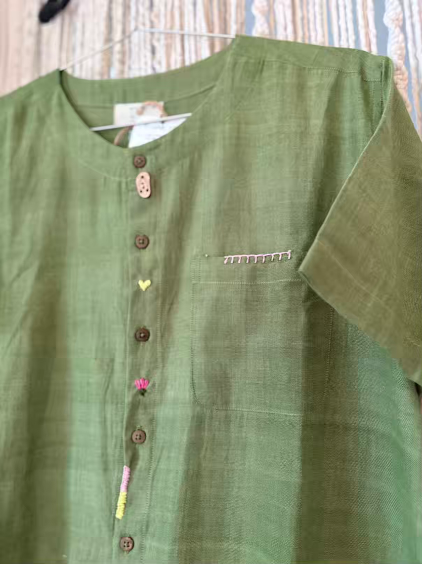 The front placket is adorned with a unique hand embroidered details , adding subtle charm and character to the design. A relaxed fit with wide half sleeves enhances comfort.